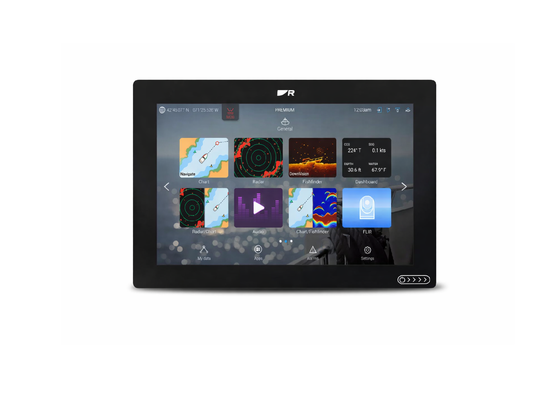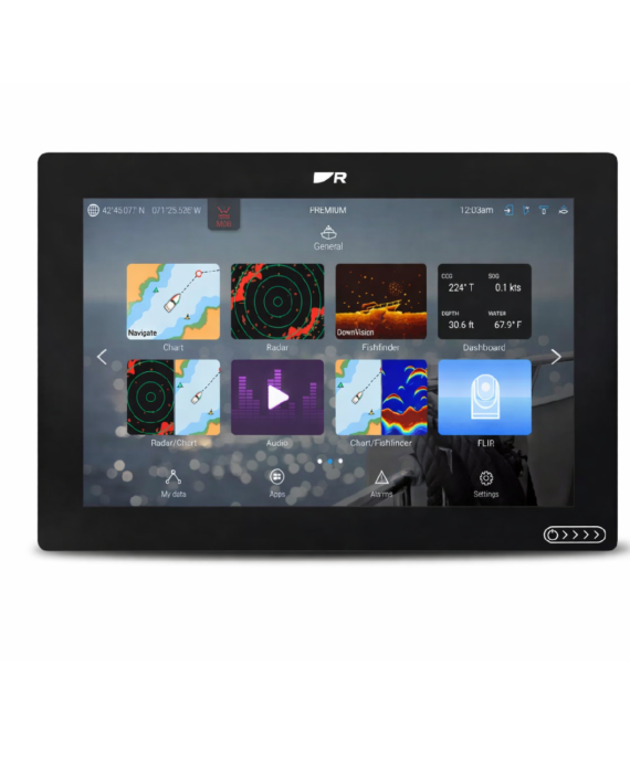 The large 12-inch HydroTough™ IPS touchscreen provides exceptional brightness (up to ~1800 nits) and wide viewing angles, ensuring clear visibility in all lighting conditions. Powered by LightHouse OS, it offers an intuitive interface with access to apps and full control of onboard electronics.